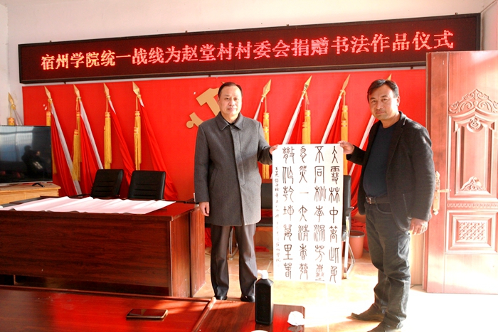 在赵堂村村委会,党委统战部部长李真、九三学社宿州市副主委方雪梅、民盟宿州市总支主委唐永刚、民进宿州学院支部主委张素枝、农工党党员、市政协委员曹少飞、知联会会长单玲玲、侨联代表崔琳等还向赵堂村小学生捐赠了红色读物、书包、文具盒、作业本等学习用品,并鼓励孩子们努力学习、健康成长,用优异的成绩回报社会和家乡,不辜负大家的殷切希望。民盟宿州学院支部主委傅华辰、曹少飞还现场泼墨挥毫,向赵堂村捐赠了书法作品。