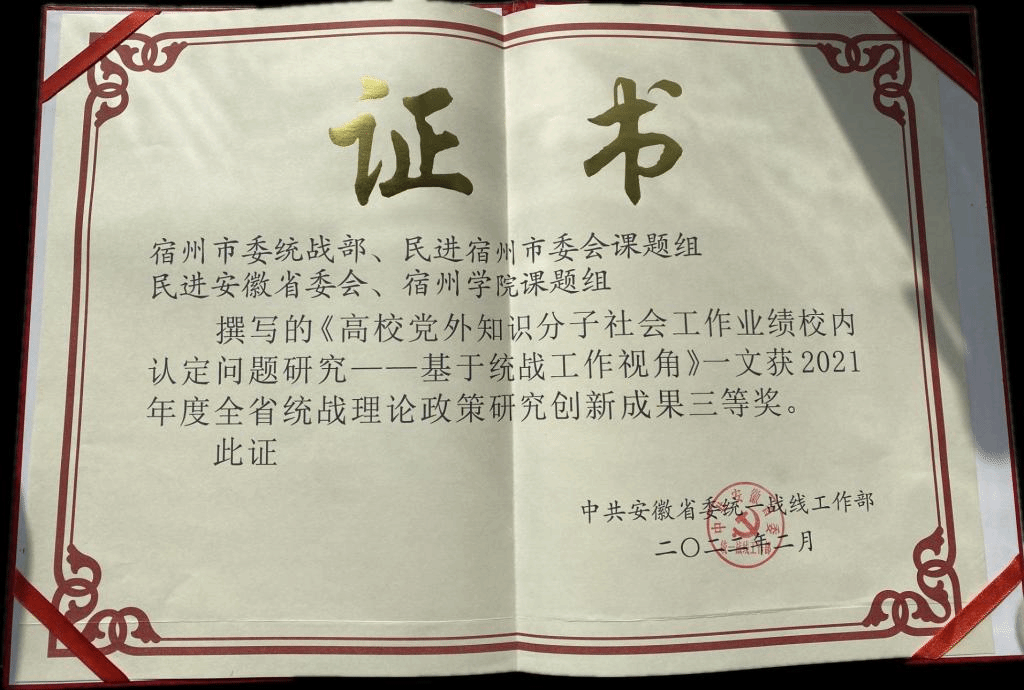 近日,中共安徽省委统战部通报表彰了2021年度全省统战理论政策研究创新、统战工作实践创新优秀成果和统战信息工作先进单位、先进个人及建言献策优秀成果。我校民进会员、机电学院教授汪材印与民进会员、商学院副教授胡良益共同撰写的统战理论研究论文《高校党外知识分子社会工作业绩校内认定问题研究——基于统战工作视角》一文获2021年度全省统战理论政策研究创新成果三等奖。