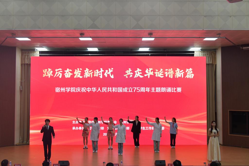 本次比赛由中共宿州学院委员会、宿州学院主办,党委宣传部、党委教师工作部、党委学生工作部、团委承办。经过前期预赛,各二级党委推荐的16支参赛队伍进入决赛,参赛作品以个人独诵、两人对诵、多人合诵等形式,配合情景剧、舞蹈、书法等多种艺术表现手法,向伟大的祖国致以最崇高的敬意和最真诚的祝福,为庆祝中华人民共和国成立75周年营造了浓厚的文化氛围。