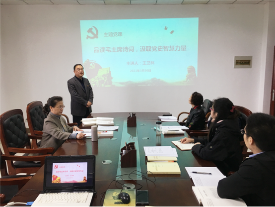 毛主席诗词创作于披荆斩棘的革命征途,书写于血与火的战场,记录了那个特定时代的艰难探索和光辉历程,反映了中华民族的崇高精神,抒发了共产党人的理想信念和价值追求,是一部生动的党史,一部鲜活的中国革命史。因此在全国开展党史学习教育热潮中,学习和品读毛主席诗词,具有十分重要的意义。王卫林经过精心准备,以“百年怒潮,数风流人物还看今朝——品读毛主席诗词,汲取党史智慧力量”为题,开启了特色党史学习教育第一课。