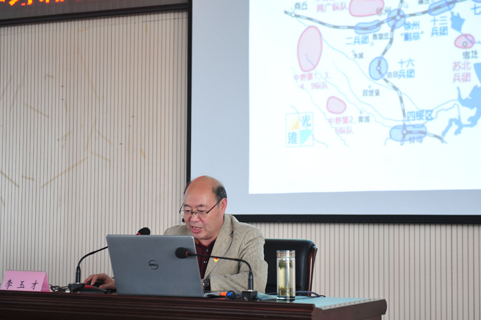 会上,马克思主义学院院长李玉才教授作了题为《淮海战役规模扩大的关键战役——宿县之战》的专题辅导报告,从“宿县之战”的决策、过程、意义三个方面进行展开。李玉才教授用生动的“宿县”方言结合一张张历史老照片,一幅幅作战地形图完整地把“宿县之战”的全过程展现了出来。“宿县之战”作为淮海战役的重要组成部分“是‘小淮海’转变成‘大淮海’的关键之战,提前完成了对徐州之敌的战略包围,形成了‘关门打狗’的战略态势,确保了南线决战目标的完美实现”。