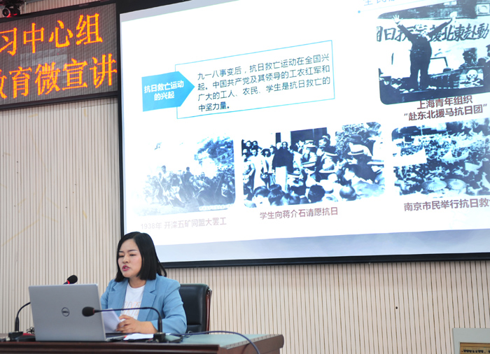报告会上,余晓宏、陈晓声、项洋、李焕四位老师结合习近平《论中国共产党历史》、《毛泽东 邓小平 江泽民 胡锦涛关于中国共产党历史论述摘编》、《习近平新时代中国特色社会主义思想学习问答》、《中国共产党简史》四本书,进行了党史学习教育宣讲。余晓宏副教授作《在新时代弘扬伟大抗战精神》主题宣讲。余晓宏指出,面对日本的野蛮侵略,中国人民毅然奋起、英勇抵抗,进行了长达十四年艰苦卓绝的抗日战争。中国人民在抗日战争的壮阔进程中孕育出伟大抗战精神,向世界展示了天下兴亡、匹夫有责的爱国情怀,视死如归、宁死不屈的民族气节,不畏强暴、血战到底的英雄气概,百折不挠、坚忍不拔的必胜信念。我们要继承和弘扬伟大抗战精神,为实现中华民族伟大复兴而奋斗。陈晓声副教授作《觉醒时代》主题宣讲。他从“对于“觉醒”的认识,新时代“觉醒”一词的内涵”两个方面进行了阐述。他指出,历史是最好的老师,要围绕中国共产党为什么“能”、马克思主义为什么“行”、中国特色社会主义为什么“好”等广泛开展宣传教育,加强思想舆论引导,坚定广大干部群众对中国特色社会主义的道路自信、理论自信、制度自信、文化自信,进一步激发全体人民爱党、爱国、爱社会主义的巨大热情。
