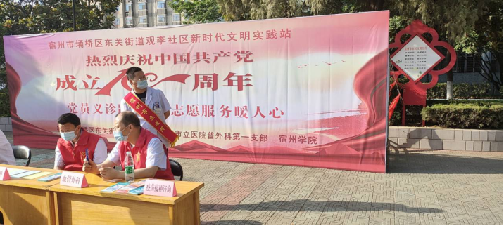 为进一步贯彻落实习近平总书记在党史学习教育动员大会上的重要指示精神,继续开展“我为群众办实事”实践活动,热烈庆祝中国共产党成立100周年。2021年5月30日,学院在汴河路校区学雷锋志愿服务广场开展义诊活动,邀请宿州市立医院肝胆胰外科、胃肠外科、肛肠外科、血管外科、泌尿外科、胸心外科、压疮护理小组、人工造口护理小组、新冠疫苗异常反应专家组成员等为我院及周边社区居民提供健康咨询服务。