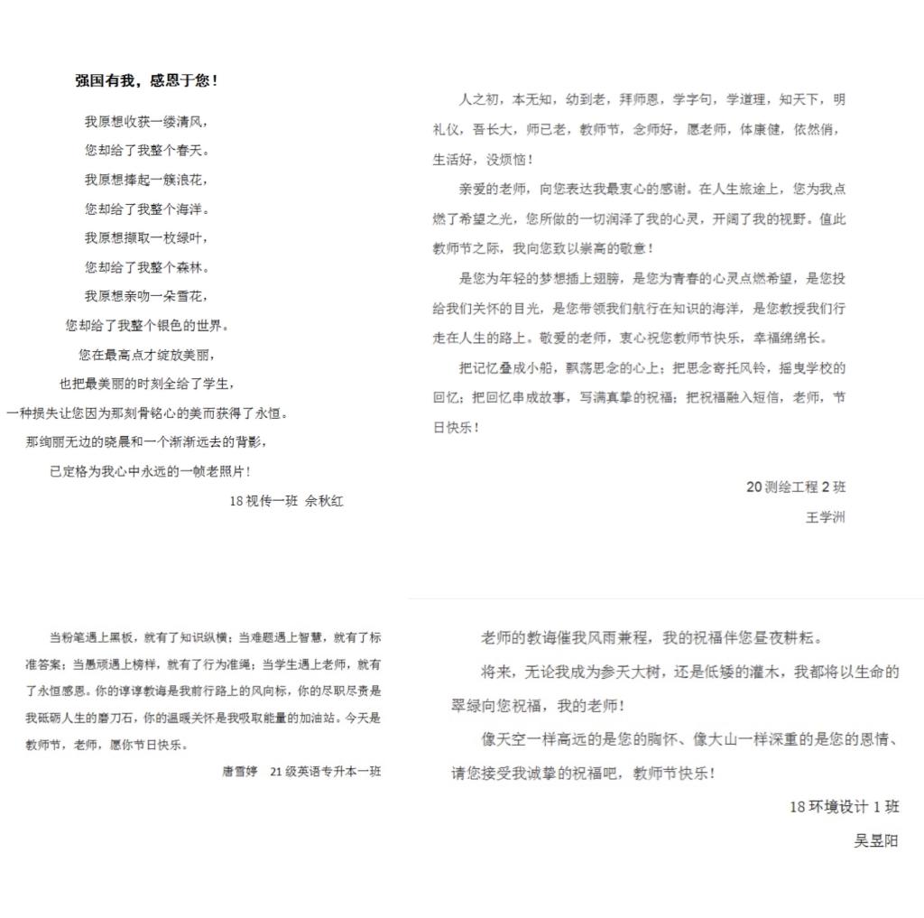 为进一步推进“三全育人”综合改革,构建“十大育人”体系,引导广大青年学生继承和发扬中华民族尊师重教的传统美德,我院于2021年9月1日至9月10日开展“心系师恩,寄语传福”教师节主题活动。