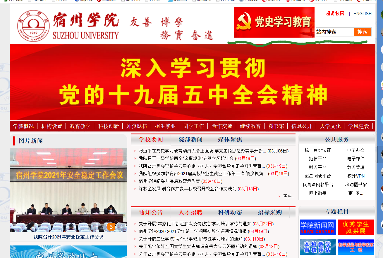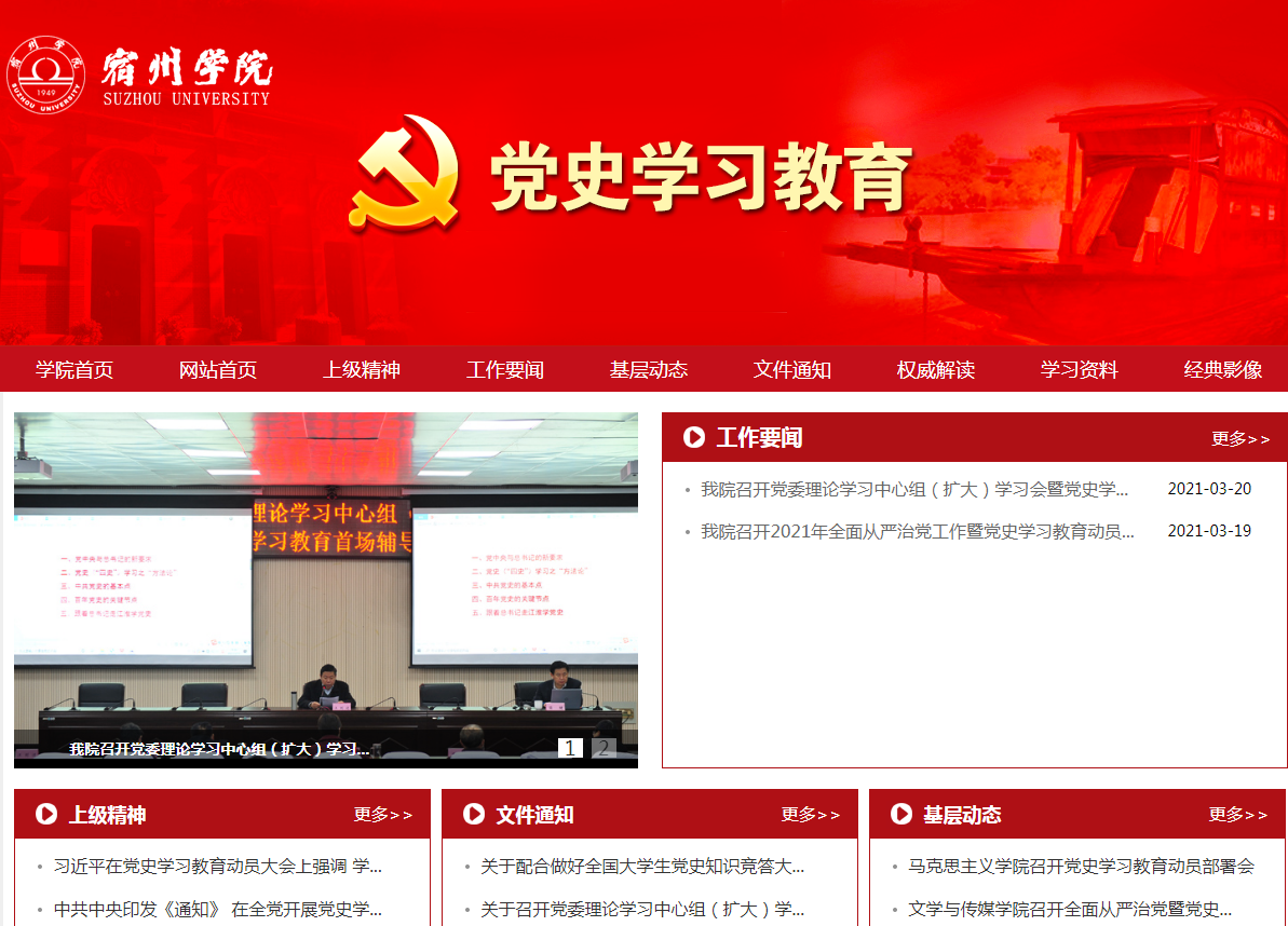 为深入学习贯彻落实中央、省委、省委教育工委关于开展党史学习教育的重要精神和部署要求,及时报道学院党史学习教育的进展情况,为党史学习教育营造良好的舆论氛围,宿州学院党史学习教育专题网于3月19日正式上线。