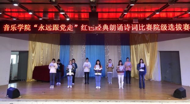 为庆祝中国共产党成立100周年,扎实开展党史学习教育,弘扬红色经典文化,更好地发挥党建引领作用,积极探索“党建+学风建设”模式,4月21日下午,音乐学院举办“永远跟党走”红色经典诗词诵读大赛院级选拔赛。本次活动由音乐学院党委主办,音乐学院团总支学生会承办,表演与学前教育专业学生党支部协办。