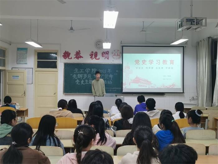 大学生党员是共产党队伍中的年轻力量,代表着蓬勃的朝气,为增强大学生党员的先进意识。5月12日晚7点,生工学院在实验楼A521举办2021年“光辉岁月,牢记历史”党史主题教育宣讲活动,生工学院各年级学生党员及入党积极分子参加本次活动。