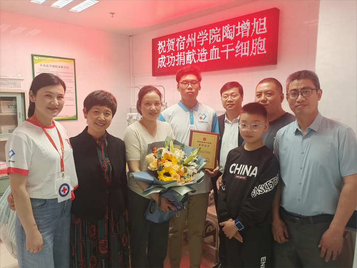 陶增旭是宿州学院第8例造血干细胞捐献者。近年来,学院将志愿服务作为加强精神文明建设、践行社会主义核心价值观、推进“三全育人”长效化的重要内容。2018年成立校红十字三献志愿服务队以来,深入校园、社区、乡镇、献血点等场所,总计组织献血知识宣传54次,大型集体献血活动18次,7200多人次参与献血,共捐献全血177万多毫升。特别是宿州学院机械与电子工程学院党委书记杨杰同志,累计献血8600毫升,他是宿州学院首例、也是安徽首位捐献造血干细胞的高校教师,在他的示范引领下,截至目前,宿州学院共有430多名师生加入中华骨髓库,实现造血干细胞捐献8例,位于全省高校前列。学院先后获评“安徽省无偿献血先进集体”和全国无偿献血促进奖特别奖;2名学生获安徽省高校学生无偿献血先进个人。杨杰荣获“宿州好人”、“安徽好人”,全国无偿捐献造血干细胞奖等荣誉。广大师生志愿者勤于实践,勇于奉献,在无偿献血与造血干细胞捐献志愿服务中谱写了一个又一个感人的故事,推动“学习雷锋好榜样”成为师生的一种生活方式和青春时尚。