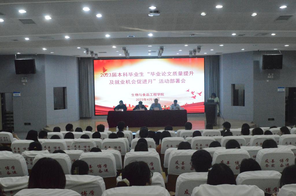 为加强生工学院毕业论文管理工作,提升2023届毕业论文质量,进一步提升学院就业指导工作水平和学生就业竞争力,生工学院于4月19日下午开展“毕业论文质量提升及就业促进月”主题教育部署活动。学院领导班子成员、毕业论文指导教师、2023届毕业班学生参加本次活动。