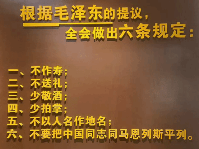 2013年7月,习近平总书记来到西柏坡。纪念馆内,总书记在一块展板前站了很久,一条一条对照:“不做寿,这条做到了;不送礼,这个还有问题,所以反‘四风’要解决这个问题;少敬酒,现在公款吃喝得到遏制,关键是要坚持下去;少拍掌,我们也提倡;不以人名命名地名,这一条坚持下来了;第六条,我们党对此有清醒的认识……”